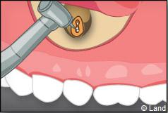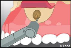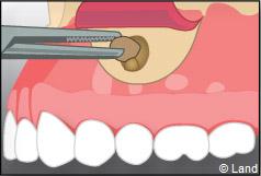 Il faut localiser le bout de la racine de la dent atteinte, procéder au décollement de la lésion avec une curette à bords tranchants, couper et enlever la partie de racine infectée.